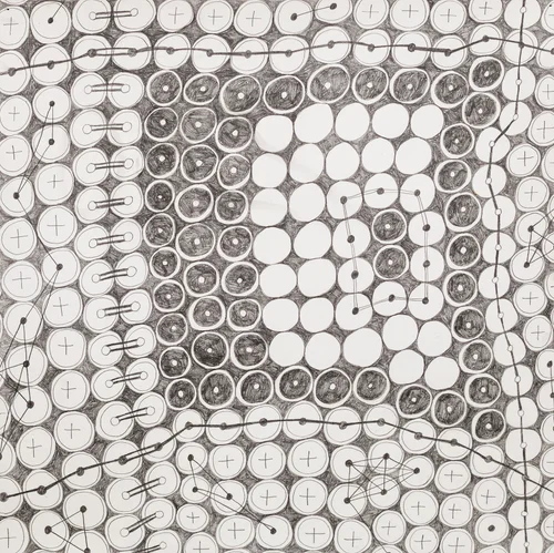 book pages, gouache, ballpoint pen, thread / 16.5" x 16.5" / 2017